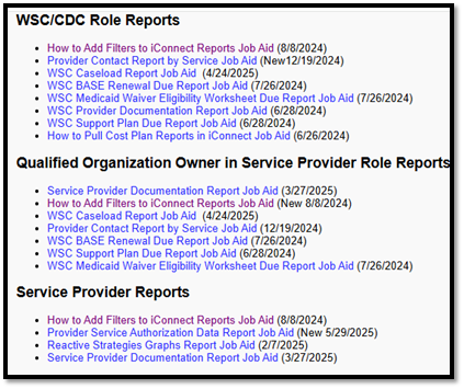 - Each section has a job aid to provide direction on how to add filters to reports from iConnect.