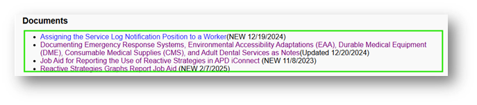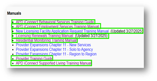 Manuals and job aids have been created to assist providers with workflows and procedures in iConnect. At times they are updated to illustrate enhancements made to iConnect. Services have specific manuals or job aids that are located and updated on the APD’s website.