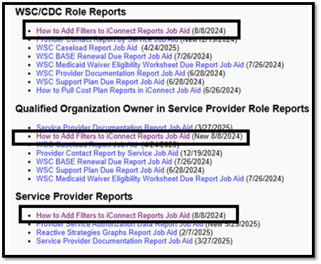 - Each section has a job aid to provide direction on how to add filters to reports from iConnect.