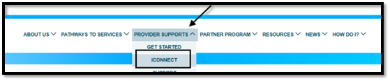 - Hover over the link for Provider Supports at the top of the page and click on iConnect.